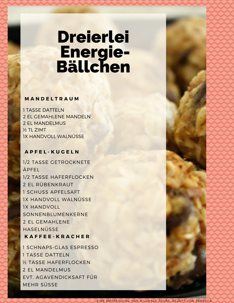 Der spezielle Hillwalk Tipp sind selbstgemachte Energie-Bällchen. Sie sind super einfach zu machen und geben Ihnen einen richtigen Energie-Kick. Die Zutaten sind austauschbar und Mengenangaben müssen nicht zu präzise befolgt werden – Hauptsache es klebt. Sie können alles in der Küchenmaschine vermengen oder sogar mit den Händen eine Masse kneten und anschließend zu Kugeln rollen. Mit Kakao-Pulver oder Zimt bestäubt geben Energie-Bällchen ein prima Geschenk ab und halten sich über eine Woche im Kühlschrank.
