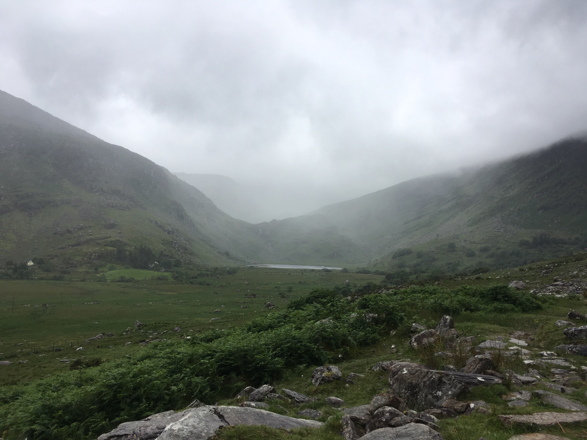 Der Wetterbericht hatte nicht gelogen. Weiße, tief hängende Wolken verhüllen die Landschaft und es nieselt noch, als wir uns auf den Weg machen. Wir kommen durch ein kleines Stück Forst in ein Tal, in dem nur noch wenige Häuser die Flanken der Berge zieren. Steile Felsklippen schauen gegenüber von uns aus den Wolken hervor. Das müssten Caher und Carrauntoohil sein. Nur, ohne die Gipfel zu sehen ist es schwer zu sagen, ob wir uns jetzt im Schatten der höchsten Berge Irlands befinden oder nicht.